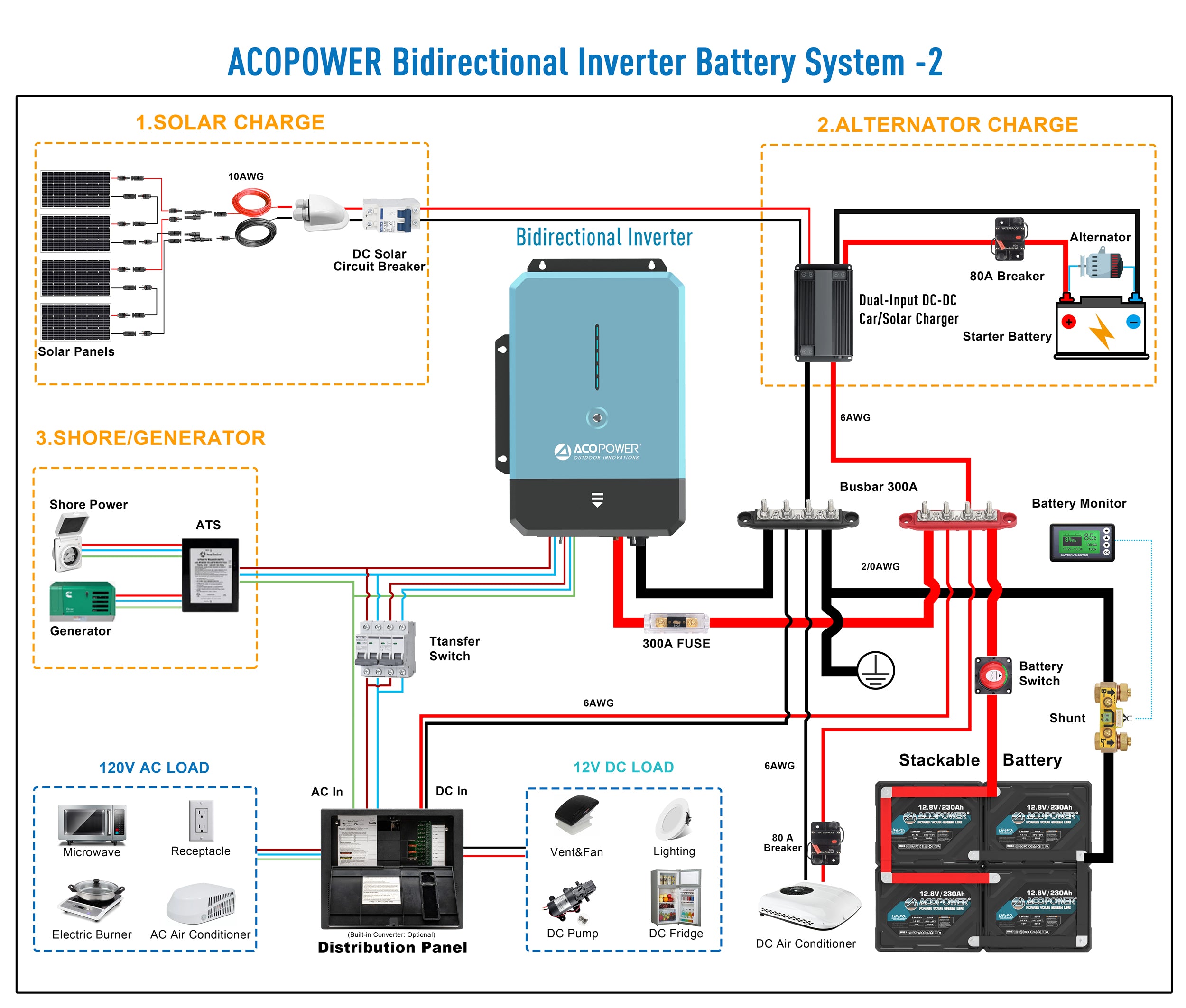 The Inverter/Battery Charger, AC Fast Charge The Inverter With Bypass when Plugged to Shore Power. Dual Input Alternator and Solar DC to DC Charger With Reverse Charging Function.